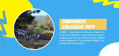 A ADIC - Associação de Defesa do Idoso e da Criança de Vilarinho, Lousã vai levar a cabo a realização de mais um evento de cariz solidário a que designou por “Caminhada Solidária”, no próximo dia 13 de outubro. Este evento vem na sequência de outros já realizados em anos anteriores e é aberto a toda a Comunidade. Vamos todos participar e ajudar a ADIC, instituição particular de solidariedade social que tem por função primordial o apoio do Idoso e da Criança, primeiro na área da freguesia de Lousã e Vilarinho, e, subsidiariamente, nas restantes freguesias do concelho da Lousã e concelhos limítrofes. Além do âmbito deste apoio social, tem a missão de desenvolver e alargar a base de apoio e da solidariedade sobretudo no que respeita à sensibilização para o voluntariado e à mobilização das comunidades para a causa da ação social. PROGRAMA DO EVENTO » Concentração junto ao novo Centro Social de Vilarinho (em obras), pelas 08h30m, sendo que o inicio da Caminhada está programada para as 09h00m, do dia 13 de outubro de 2019. » Valor da inscrição: 10 solidários. Gratuito para as crianças até aos 12 anos. » Percurso: Encosta serrana sobranceira e áreas florestais adjacentes ao lugar de Vilarinho e com a extensão de cerca de 10 Km. » Os participantes têm direito a: Reforço, almoço e seguro. » A organização oferece ainda uma T-shirt alusiva ao evento. » As verbas angariadas revertem em prol do desenvolvimento da Associação. » Inscrições até ao dia 10 de outubro, na Sede da ADIC em Vilarinho, através do email geral@adic.pt e/ou online AQUI. Participe com a sua presença!!!